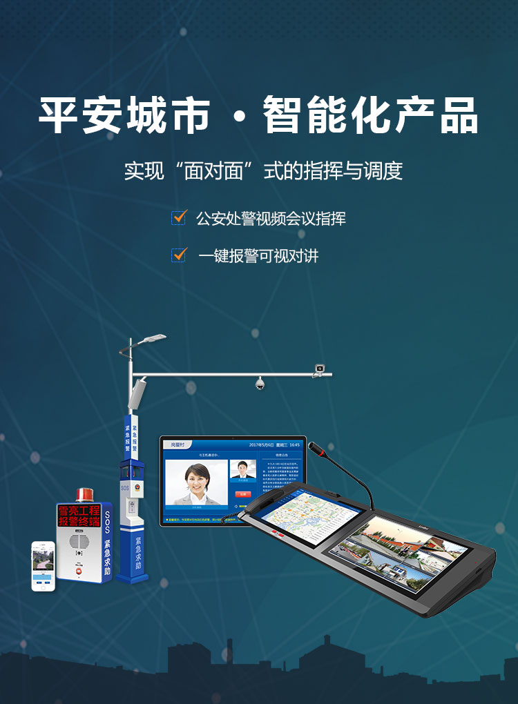 整合平安城市二大子系统,具有公安处警视频指挥、一键报警可视对讲,为平安城市提供可视化的一键报警、视频指挥解决方案。
